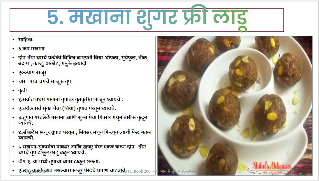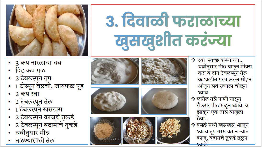 - आमची आई सुगरण (E Book 210)मी जळगाव खांदेशीची माहेरची आहे. प्रारंभी, मी आईकडून शिकले आणि नंतर मोठ्या बहिणीच्या कुशल हातांच्या रेसिपीज शिकले. या पुस्तकात मी त्यापैकी काही रेसिपीज सादर करत आहे. पदार्थांचे वर्णन अधिक आकर्षक व्हावे म्हणून इंटरनेटवरील फोटोंचा उपयोग केला आहे. जर कोणाला याबद्दल आक्षेप असेल तर ते फोटो काढून टाकले जातील.