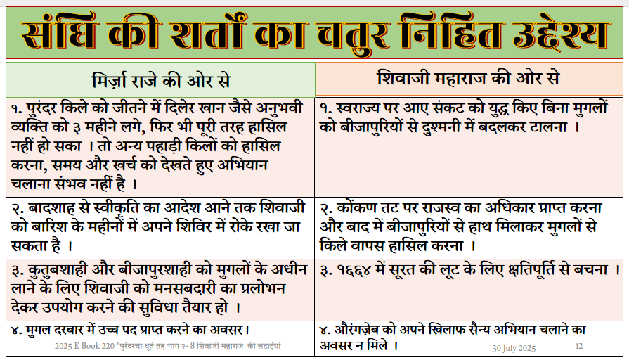 यह संधि तक पहुंचने वाली नाटकीय घटनाओं, जिनमें मुरारबाजी देशपांडे का वीरतापूर्ण बचाव शामिल है, का विवरण देती है. इसमें वार्ताओं की समयरेखा और दोनों पक्षों द्वारा रखे गए प्रस्तावों को रेखांकित किया गया है. मिर्झा राजा की मांगों में 35 किले और भारी राजस्व शामिल था, जबकि शिवाजी महाराज ने रणनीतिक रूप से 23 किले और 12 से राजस्व को सद्भावना के प्रतीक के रूप में पेश किया, जिसका उद्देश्य मराठा स्वायत्तता को बनाए रखना और मुगल-बीजापुरी प्रतिद्वंद्विता का लाभ उठाना था.