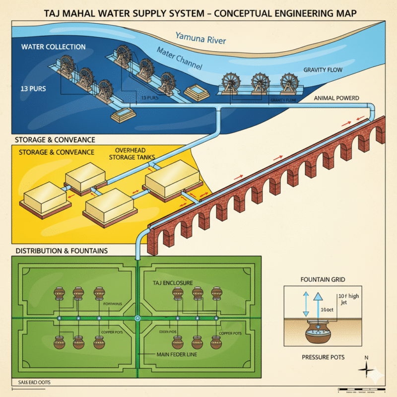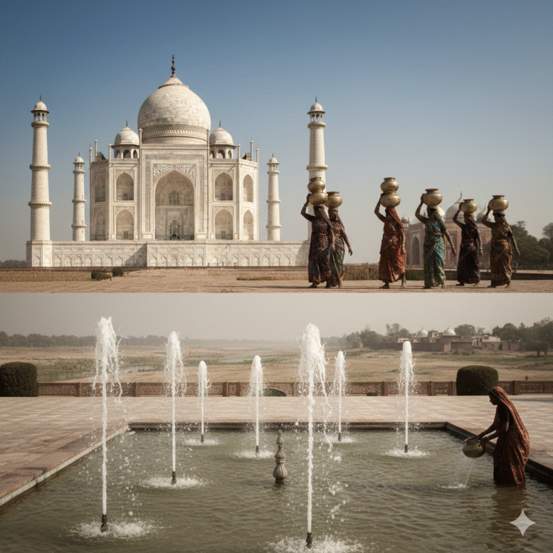 माझ्या दृष्टीने पाणी पुरवठा योजना कशी असावी. हा आहे. ताजमहालाच्या काळात फवारे ही तेव्हा चैनच होती. पण सामान्य कुटुंबाला बहुधा बायकांना नदीच्या पात्रात उतरून पाणी डोक्यावर एका वर एक अशा कळशीतून लांबवरून आणावे लागत होते. पिण्याच्या पाण्यासाठी भिस्ती पखालीतून पाणी पैसे घेऊन फिरत असत. एका इंग्रजांच्या काळातील ताजमहालाच्या परिसरातील फोटोत लोक बसले आहेत तिथे एक भिस्ती पाण्याची पखाली घेऊन उभा आहे असे दिसते.