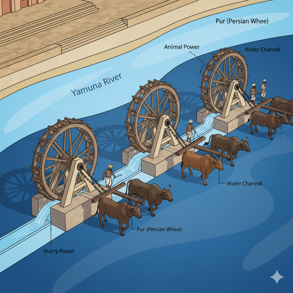 माझ्या दृष्टीने पाणी पुरवठा योजना कशी असावी. हा आहे. ताजमहालाच्या काळात फवारे ही तेव्हा चैनच होती. पण सामान्य कुटुंबाला बहुधा बायकांना नदीच्या पात्रात उतरून पाणी डोक्यावर एका वर एक अशा कळशीतून लांबवरून आणावे लागत होते. पिण्याच्या पाण्यासाठी भिस्ती पखालीतून पाणी पैसे घेऊन फिरत असत. एका इंग्रजांच्या काळातील ताजमहालाच्या परिसरातील फोटोत लोक बसले आहेत तिथे एक भिस्ती पाण्याची पखाली घेऊन उभा आहे असे दिसते.